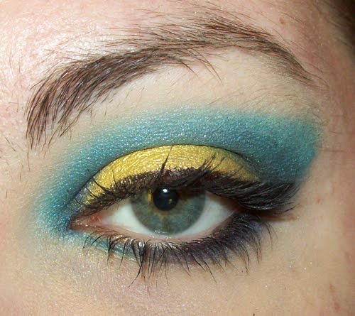 Step 6: Since apparently, I don't have this chronology thing down, I skipped a few steps so this is a few in one. Take a yellow shadow (Explode) and the flat shader brush (2) and pat it all along the lid, being careful not to mix it with the blue colors. Then take the big fluffy shadow brush (1) and face powder and clean up your lines. See how much less janky it looks now? I also blend it along the top of the light blue shadow as well as under the brow bone for a nice fade. You can thank Petrilude for showing me that tip.